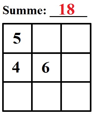 Wir haben 9 Felder. Und über diesen steht entweder Summe oder Zaubersumme. Diese Summe muss beachtet werden. Ziel ist es, alle Felder auszufüllen. Dies kann so aussehen: