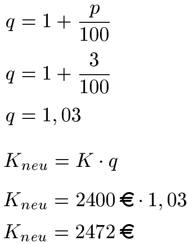 Das Anfangskapital ist K = 2400 Euro. Der Zinssatz p % = 3 %. Daher ist der Zinssatz p = 3. Dies setzen wir zunächst in die Formel für den Zinsfaktor q ein und berechnen diesen. Im Anschluss setzen wir alles in die Formel für das Endkapital ein. Die Endsumme liegt bei 2472 Euro.
